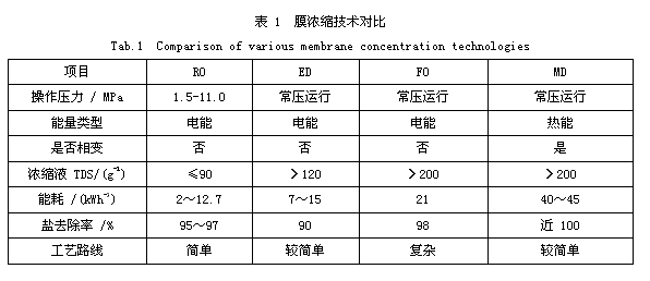 上述4種膜濃縮技術(shù)對(duì)比如表1所示。其中,普通RO濃縮能夠達(dá)到的含鹽量有限,需要與 FO、ED、MD 進(jìn)一步組合或增設(shè)蒸發(fā)器進(jìn)行再濃縮;FO雖有工程實(shí)例,但工藝路線復(fù)雜,成本高;ED技術(shù)電廠低品廢熱優(yōu)點(diǎn),在脫硫廢水零排放領(lǐng)域具有潛在應(yīng)用前景,但仍缺少適于工業(yè)化穩(wěn)定運(yùn)行的蒸餾膜材料。4種膜濃縮技術(shù)都需要軟化,抗污染能力一般 MD>FO>ED>RO。